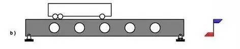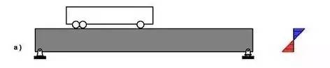 a 图就是最普通的梁式桥,完全依靠受弯承载。这种形式非常常见,地铁、高架、小型公路桥梁,几乎全部是这样的。右边是它的截面的应力分布,上下边缘受力大,中间位置几乎为零。也就是说,整个截面的应力并不是平均分配的,尽管中间位置几乎没有应力,但是,只要上下边缘达到了极限,整个截面同样可以被破坏。