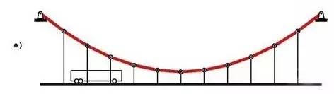 如果把这个最优化的趋势做到极致,那就达到了 e 图这种的悬索结构。整个悬索承受同样大小的拉力,整个悬索的拉力由支座处的锚固平衡。其实这种结构非常好理解,把 e 图想象成一根晾衣绳,上面晾了11件衣服,而晾衣绳的两端,需要牢固的栓在墙上或者柱子上。很容易理解吧?比较难理解的是如何解决锚固处巨大的力?