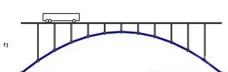 f 图所示的拱桥就是另一个方向的极致,与 e 图上下对称,f 图中的拱结构只承受压力,也不承受弯矩。但与纯受拉的悬索结构相比,受压的拱结构还牵扯到稳定问题。举个例子,你用脚踩放在地上的空易拉罐,很难把它踩碎,但是很容易就把它踩变形、踩扁了。因此,拱结构的效率还是比不上悬索结构。