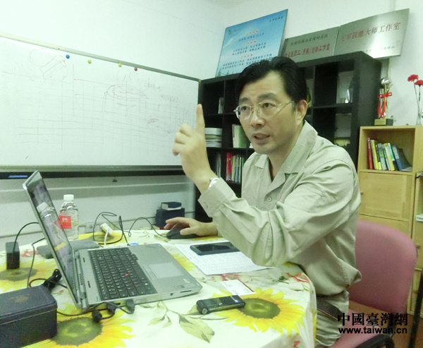王军在工作室接受记者采访,畅谈工作和创新经历。(中国台湾网 王文英 摄)