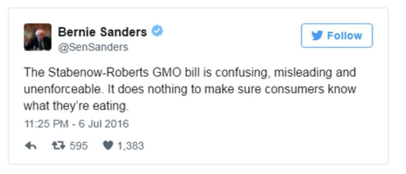 支持标识派、民主党参议员伯尼·桑德斯就抱怨说,“这个法案令人迷惑、被误导,而且无法执行。这法案无助于消费者知道自己吃了啥。” 图片来源:推特截图。