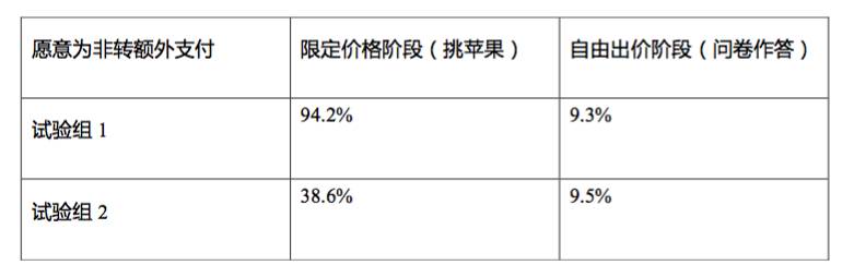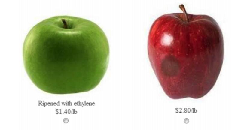 在对照组中,人们愿意为了“非乙烯催熟”的苹果多付91.0%(即$1.91)——这和试验组1中人们愿意为了非转基因食物多付的94.2%(即$1.98)没有显著差别。
