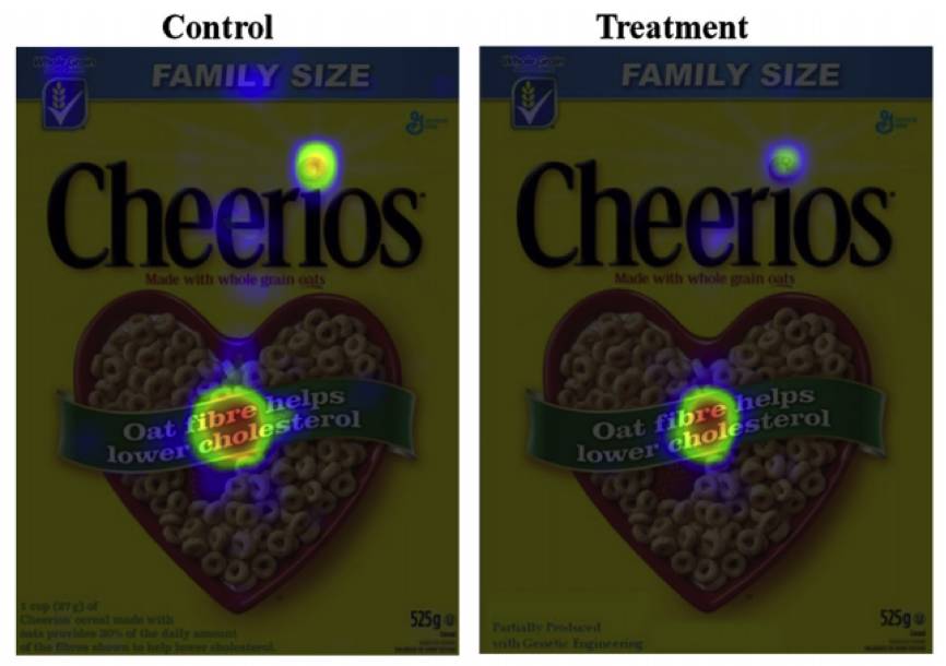 在对照组中,包装左下方用小字写着“一杯Cheerios燕麦麦片提供30%每天所需膳食纤维,更有助于降低胆固醇含量”。试验组中,包装左下方则将说明改为“包含部分转基因成分”。