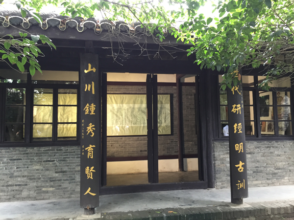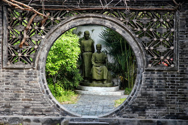 转身向北,透过灰砖镂空的圆门,迈入一方充盈着绿色的小院,翠竹掩映中的王念孙、王引之父子二人的古铜色塑像分外引人注目。端坐石凳之上的王念孙长衫过膝,双目平视,神清气定,左手扶一竿木手杖,右手握着一册翻开的书。站立右侧身后的王引之,两手垂放,双目微闭,似有所思。这座塑像是根据书画大师程十发先生所作的画像进行雕塑的,神态自然生动。