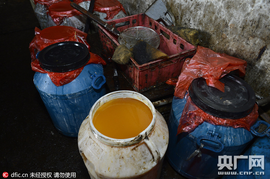 7月29日,云南昆明,经过一段时间的摸排后,五华区城管牵头组织当地各部门对位于沙朗马料盘一个非法回收餐厨废弃物的黑作坊进行联合查处。现场查处成品油60桶,“黑猪血”3吨。图为黑作坊内堆满了成桶的地沟油。