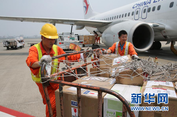 资料图:7月28日,在上海虹桥国际机场,东方航空公司地面服务部的赵福勤(左)和同事在搬运从飞机上卸下的货物。 夏日里,劳动者冒着高温坚守岗位。新华社记者 裴鑫 摄