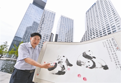 昨日,作为大熊猫文化研究专家,谭楷展示了他为佳佳所作的画,画作展开约有1米多长,画上有两对大熊猫,正好与香港海洋公园的4只大熊猫对应。它们神态各异,或躺、或坐、或站、或趴,一边嬉戏,一边吃着苹果,“前后作了三幅,我最满意的一幅已经裱好送去香港。”谭楷为佳佳同时赋诗一首:长寿之星必常乐,百岁佳佳趣事多。紫荆花下抱海梦,胜似家乡唐家河。”