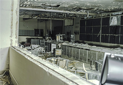 紧邻事发地的是个操作间,由一面大窗户相隔,受爆裂冲击只剩下框架。房间天花板被炸毁,随处可见玻璃碎片和扭曲的金属条,已散架的桌椅东倒西歪,一片狼藉。