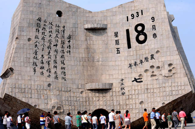 沈阳“九一八”历史博物馆残历碑。巨大的碑面设计成一页翻开的日历,永久地定格在“1931年9月18日”。