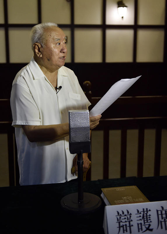 8月25日,当年特别军事法庭辩护人李长泰在沈阳审判日本战犯旧址陈列馆重读他辩护词的一段。