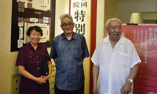 8月25日,当年特别军事法庭辩护人李长泰(右)、书记员权德源(中)、工作人员马凤云(左)在沈阳审判日本战犯旧址陈列馆内合影。新华社记者 姚剑锋 摄