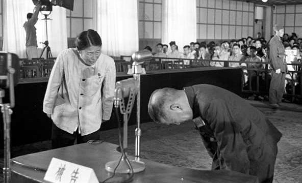1956年7月1日至7月20日,最高人民法院特别军事法庭在沈阳审判伪满洲国国务院总务长官武部六藏等28名日本战犯。证人周华祯在法庭上哭诉被告人佐古龙祐的罪行。这是被告人低头认罪。 新华社记者 于肇 摄