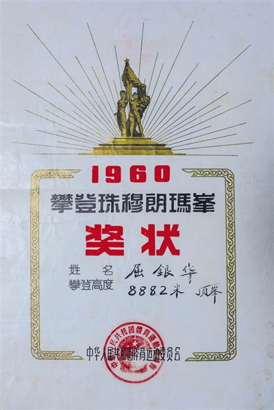 家属展示屈银华当年攀登珠峰后的奖状。新京报记者 彭子洋 摄