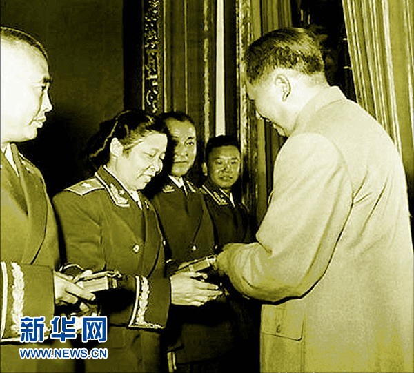 1955年,毛泽东主席将一级解放勋章授予李贞(资料照片)。 新华社发
