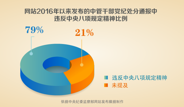 从中央纪委监察部网站2016年以来发布的中管干部党纪处分通报看:近八成有违反中央八项规定精神问题