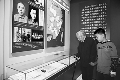 八路军老战士秦梦山带着孙子参观“英雄史诗 不朽丰碑——纪念红军长征胜利80周年主题展览”。光明图片/视觉中国