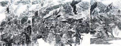 【创作谈】整幅作品的创作意图,在还原历史事件的同时,力求表达悲壮、英勇、惨烈的战争氛围。画面在构图形式上强调对“势”的把控,通过典型人物、场景、道具的远近、大小、比例、超时空组合等方式,合理有序地控制画面内容,以获得力感与量感相对饱满的视觉体验。画面人物的刻画以厚重阴郁作为基调,既贴合创作的主题,同时又强调墨色的不同层次。局部深入刻画的同时又保留部分初稿的未完成感,形成画面的多层次对比,既有传统水墨的表现力,同时亦具备当代水墨的个性表达。画面在表现形式与手法上,刻意与传统水墨语言拉开距离,通过反复的勾皴、积墨、拓印、水墨冲染等手段,寻求浑厚而丰富的画面效果。