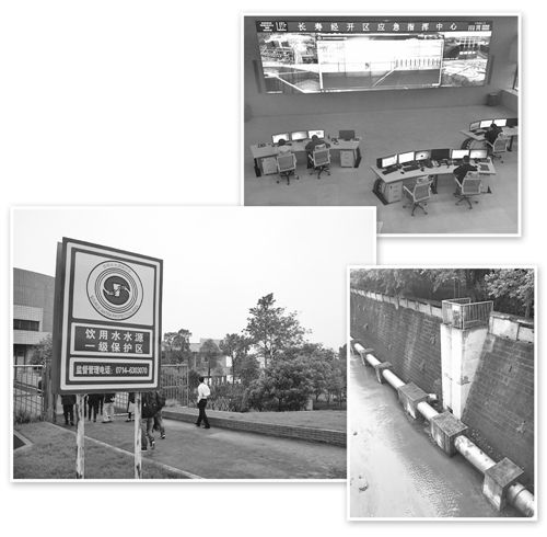 上图:重庆长寿区经济技术开发区应急指挥中心。左图:黄石花湖水厂长江取水口附近的标识牌。右图:重庆长寿区经济技术开发区企业环境应急池及配套设施。