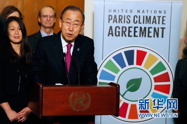 11月4日,在位于纽约的联合国总部,联合国秘书长潘基文就《巴黎协定》正式生效向媒体发表讲话。 新华社记者李木子摄
