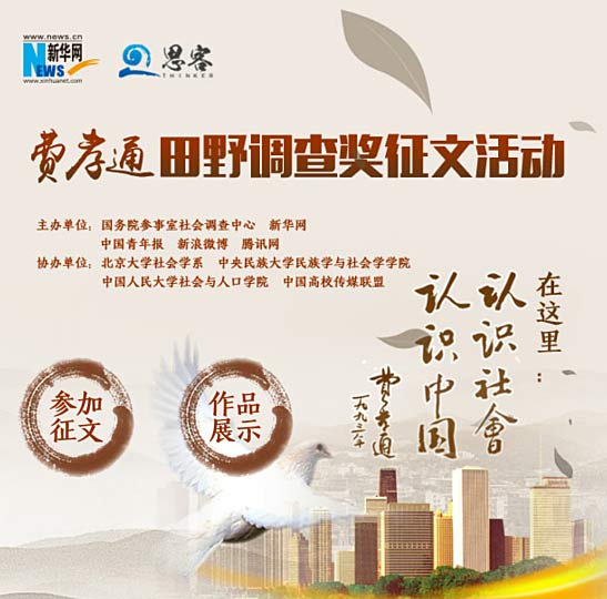 国务院参事室社会调查中心近日联合新华网、中国青年报、新浪微博、腾讯网,在江苏省苏州市吴江区的费孝通江村纪念馆共同发起“费孝通田野调查奖”征文活动。