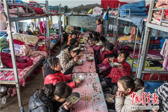 很多宿舍没有窗帘和储物柜;食堂的饭菜谈不上有营养,比起蛋奶,孩子们更爱吃辣条、方便面这些含添加剂的零食;许多宿舍的厕所用不了,也没有热水。有老师形象地总结:“闻味道就知道哪个是寄宿生。”