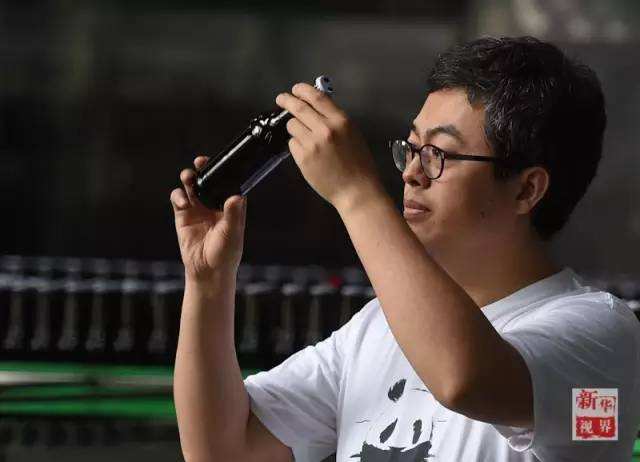 ↑潘丁浩检查装瓶质量。