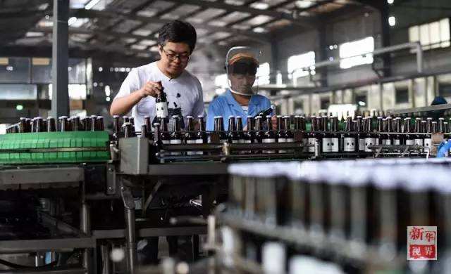 ↑潘丁浩和工作人员一起检查装瓶质量。