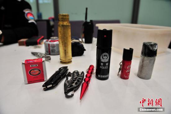资料图:昆明长水国际机场安检站工作人员,向记者展示春运开始以来查获的如皮带扣打火机、iPhone造型打火机、手表打火机、烟花爆竹、子弹等各种违禁物品。中新社记者 刘冉阳 摄