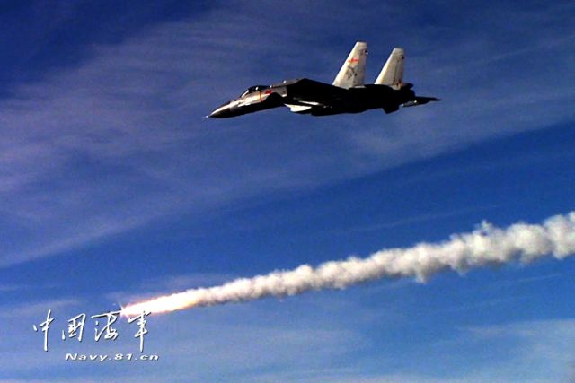 ↑资料照片:歼-15舰载战斗机发射导弹。