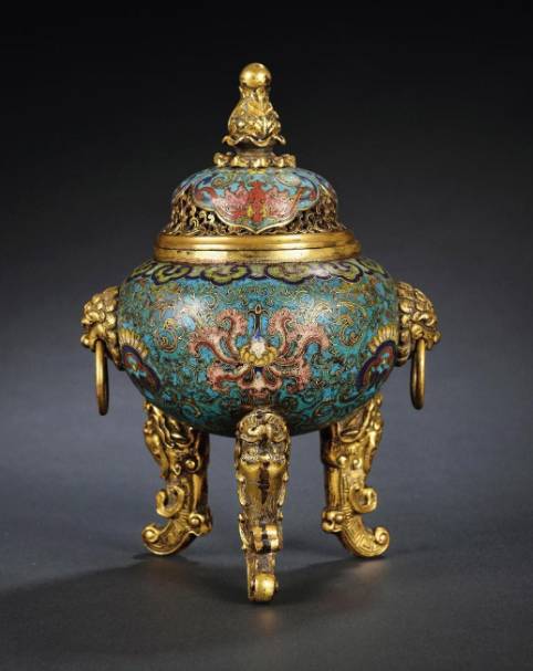 (清中期铜鎏金掐丝珐琅花卉兽耳三足熏炉,故宫博物院藏)