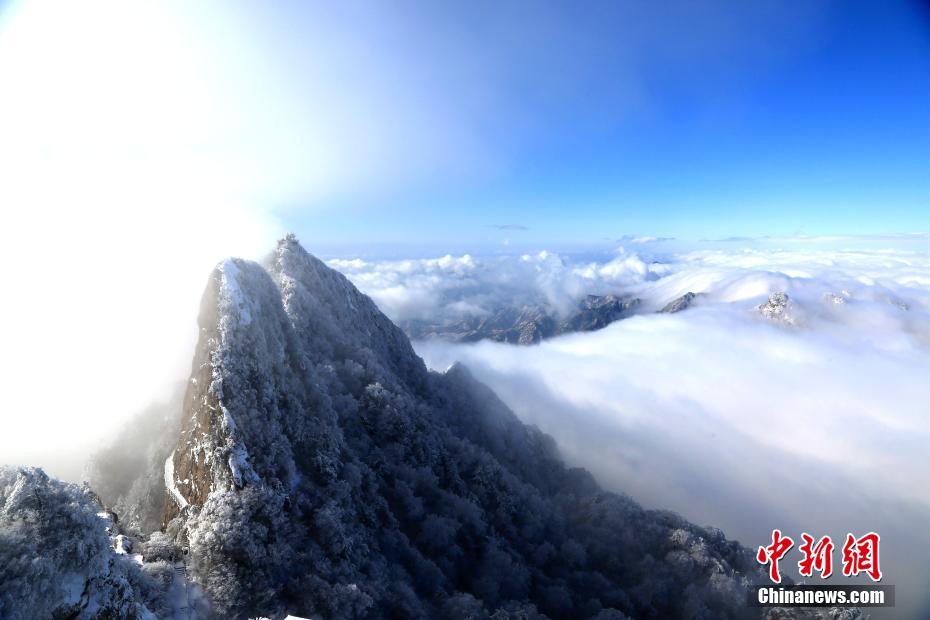 1月7日,连续降雪之后,位于河南洛阳的道教圣地老君山雪后初晴,海拔2000米的伏牛山主峰上,白雪皑皑、银装素裹,加之云海浮现与蓝天白云交相辉映,绝壁道观似琼楼玉宇幻如仙境美不胜收。图为云海流过山间。王中举 摄