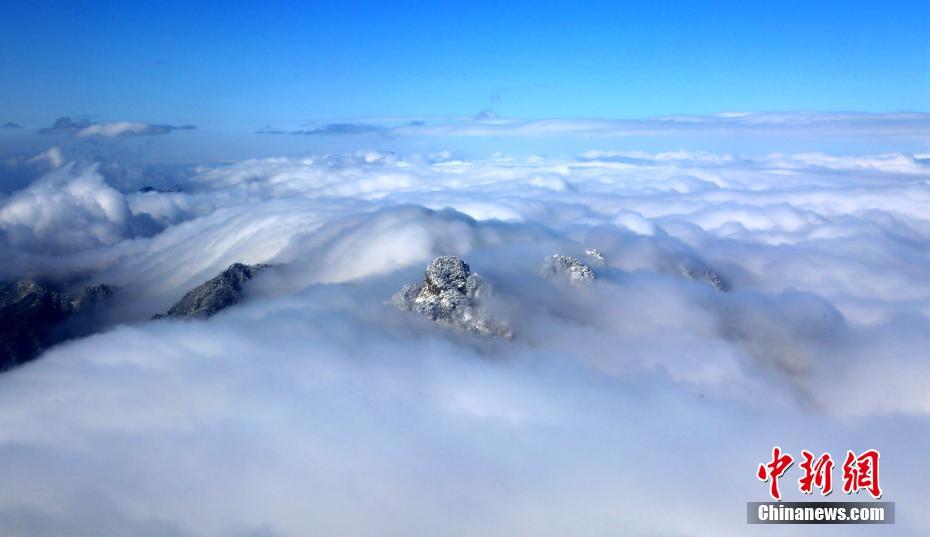 1月7日,连续降雪之后,位于河南洛阳的道教圣地老君山雪后初晴,海拔2000米的伏牛山主峰上,白雪皑皑、银装素裹,加之云海浮现与蓝天白云交相辉映,绝壁道观似琼楼玉宇幻如仙境美不胜收。图为云海波涛汹涌,“淹没”山顶。王中举 摄