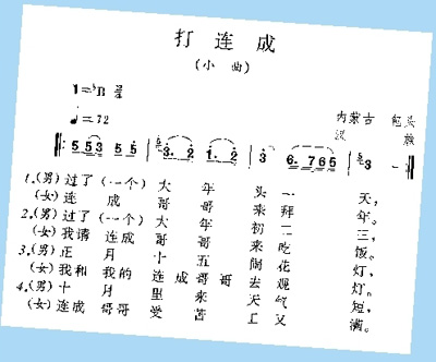 这首小调更突出的特点是它的音调,前两个乐句以及最后一个乐句的开头,均有一个十度大跳。四个乐句的结尾处还都有个六度音型,一首19小节的短歌中竟有7处出现了大跳音型,如何看待这种音调的艺术特色呢?在阴山绵延的内蒙古西部地区,无论是小调、爬山调(山歌),还是“二人台”(歌舞、坐唱、戏曲)以及“蒙汉调”,人们都喜欢在曲调中采用一系列五度以上的跳进,尤其爱用八度以上的大跳音型,以直抒其豪放、刚烈之情,也由此形成了特殊的音乐风格,这是一种值得注意的地域现象。