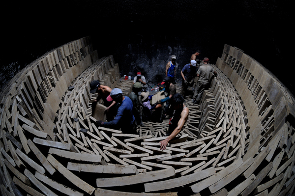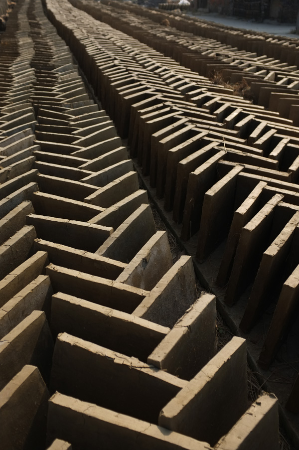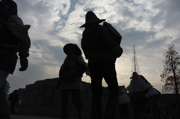 赶在日出之前,窑工们将砖胚搬进窑内。