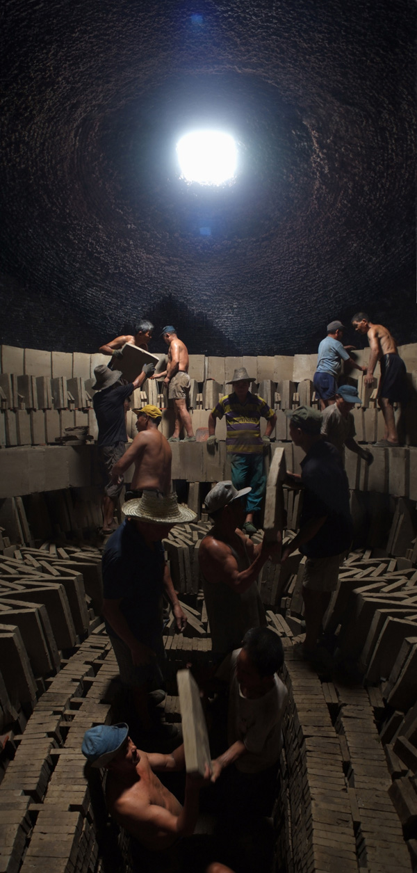 正午阳光穿过窑洞,照在辛勤工作的窑工身上。烧制一窑京砖需要约30名工人协作。