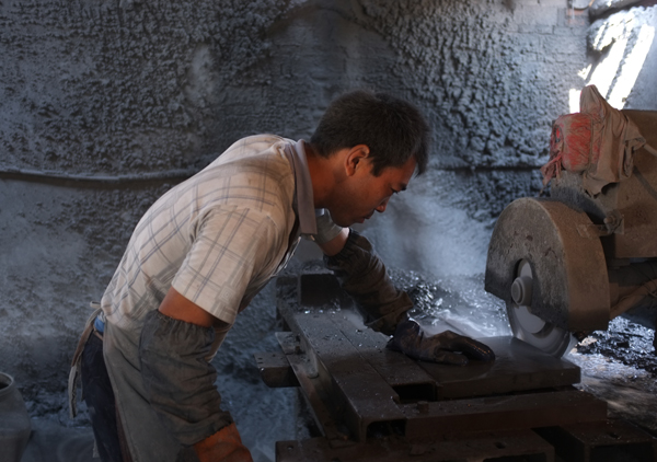 京砖成品前的最后一道工序:切割打磨。