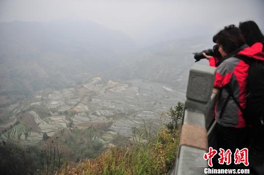 游客在哈尼梯田景区拍照。 刘冉阳 摄