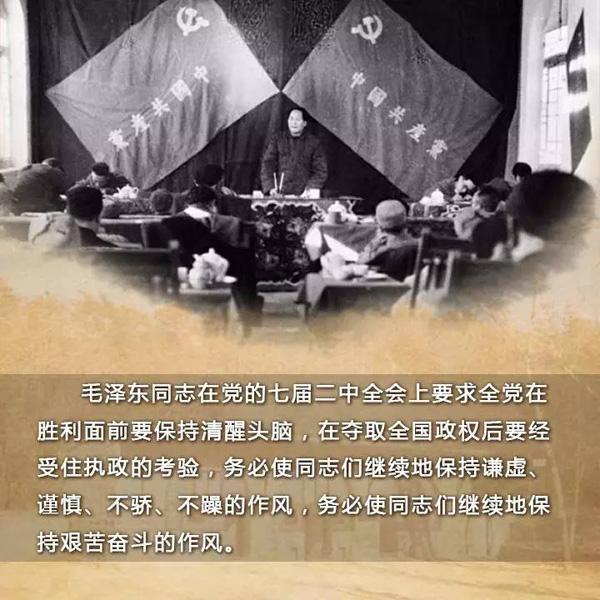 中共中央进驻北平,中国共产党的地位很快成为执政党。为此,毛泽东主席联想起中国历史上的农民起义领袖李自成,由于居功自傲,导致失败的沉痛教训。于是他多次向中央工作人员讲述李自成进北平的历史故事,并反复告诫大家“我们不要学李自成”。