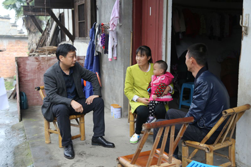 江西上饶县田墩镇党委书记孙学群(左一)在荷家村贫困户饶美丽家走访