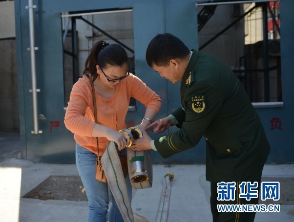戴亚强带记者体验如何对接两个水袋。(新华网 郭小天/摄)