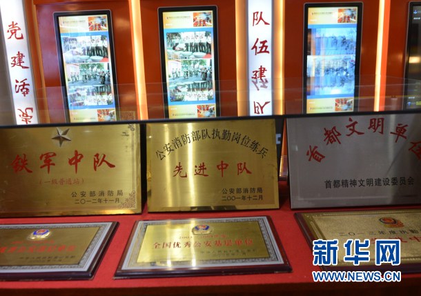 北京海淀区双榆树消防中队所取得的荣誉。(新华网 郭小天/摄)
