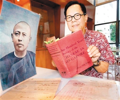 图为陈继廉展示《新加坡华人百年史》。