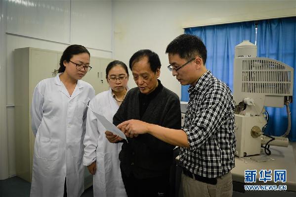 老院士王泽山:“一辈子专注做一件事” 在南京理工大学的实验室,王泽山院士(右二)对团队成员刘志涛(右一)等进行实验指导(2016年10月21日摄)。新华社记者 季春鹏 摄
