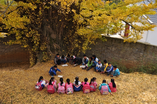 贵州省威宁县盐仓镇二堡村二堡小学的学生在古银杏树下温习功课。视觉中国供图(资料图片)