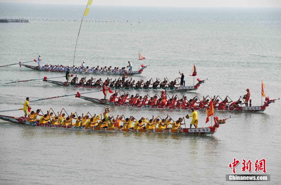 5月27日,连江县筱埕镇定海村村民在海上进行龙舟比赛。当日,福建省连江县筱埕村和定海村举行海上赛龙舟活动。据了解,当地在明朝万历年间就有了海上赛龙舟的传统,至今这个习俗已经保持了四百年,已经成为当地独特的风景。 张斌 摄