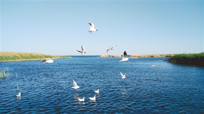 内蒙古阿拉善盟额济纳旗境内,曾经干涸的居延海,如今成为美丽湿地。记者 刘 毅摄