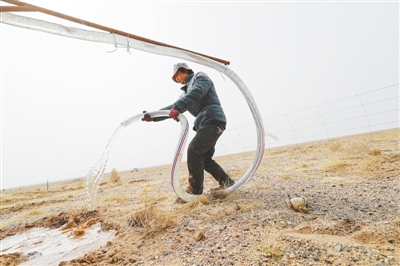 在阿拉善左旗希勃图嘎查,一位牧民为刚种上的梭梭浇水。新华社记者 沈伯韩摄