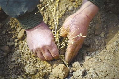 在阿拉善左旗希勃图嘎查,一位牧民在种植梭梭。新华社记者 沈伯韩摄