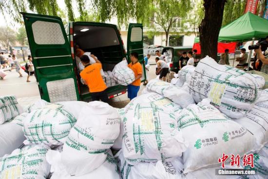 6月29日,山西太原,高校毕业生们正在邮寄返乡快递包裹。 张云 摄