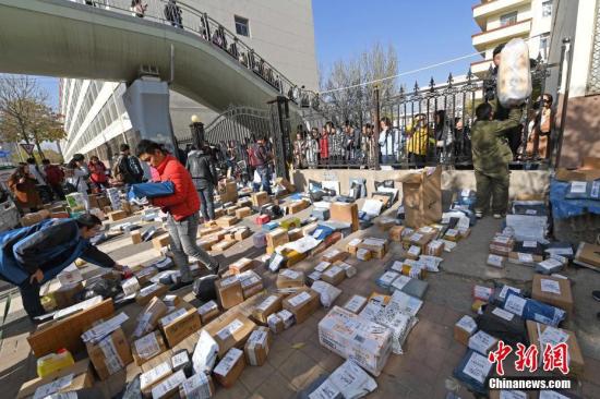 图为工作人员忙着分拣满地的快递。 武俊杰 摄
